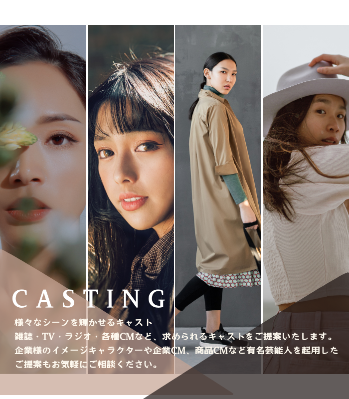 キャスティング モデル 女優 専属および登録タレント(マネージメントを受託)を含め、あらゆるキャスティングニーズに対応します。赤ちゃんからシニアまでの役者や、映画やドラマに適した役者から、アクションやダンスなどに対応するパフォーマーまで、様々な映像プロジェクトに対応しています。 メインの役だけでなく、エキストラを含むすべてのキャスティングを弊社のみで完結できる豊富なキャスティングを行っております。 出演依頼に関するお問い合わせは当社HPのcontactフォームよりご連絡ください。 アート事業 前の記事